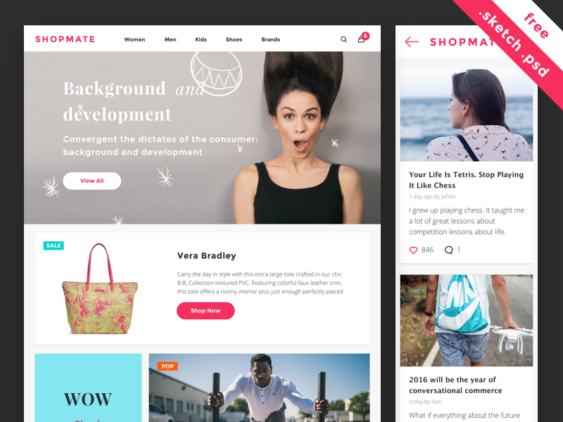 Try Shopmate for free! This small freebie comes with .sketch and .psd files. 5 web and 5 mobile pages.